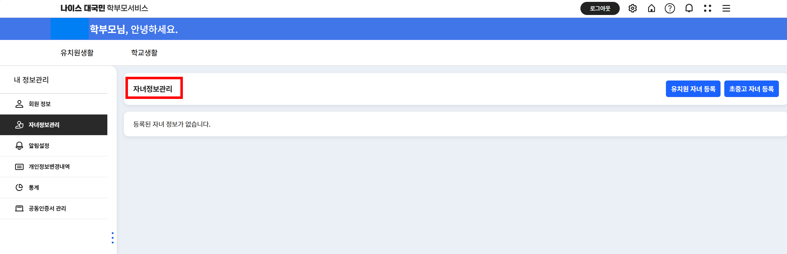 자녀의 학적 정보를 등록하여 조회 가능 합니다.