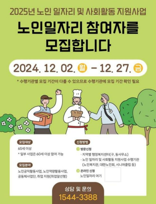 자세한 내용은 해당 사이트에서 확인하거나, 노인일자리 상담 대표전화 ☏1544-3388로 문의하시면 됩니다.