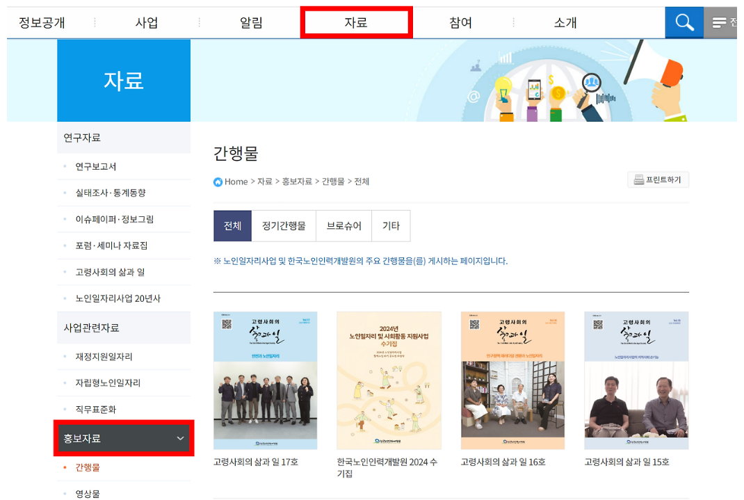 노인일자리에 대한 정부의 방향성과 여러 가지 이슈를 하나의 책자로 발행하여 공유하고 있는데요.