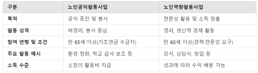 - 공익활동, 사회서비스, 시장형 사업, 창업형 사업 등 다양한 노인 일자리 유형에 대한 설명과 참여 조건을 제공합니다.