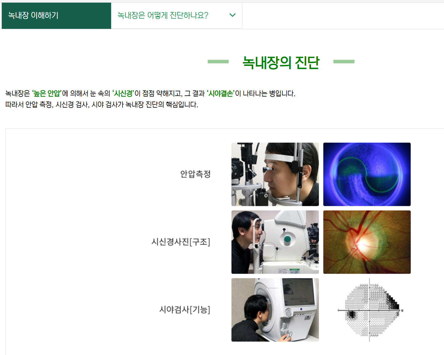 병원에서는 다음과 같은 정밀 검사를 통해 녹내장 여부를 판별하게 됩니다.