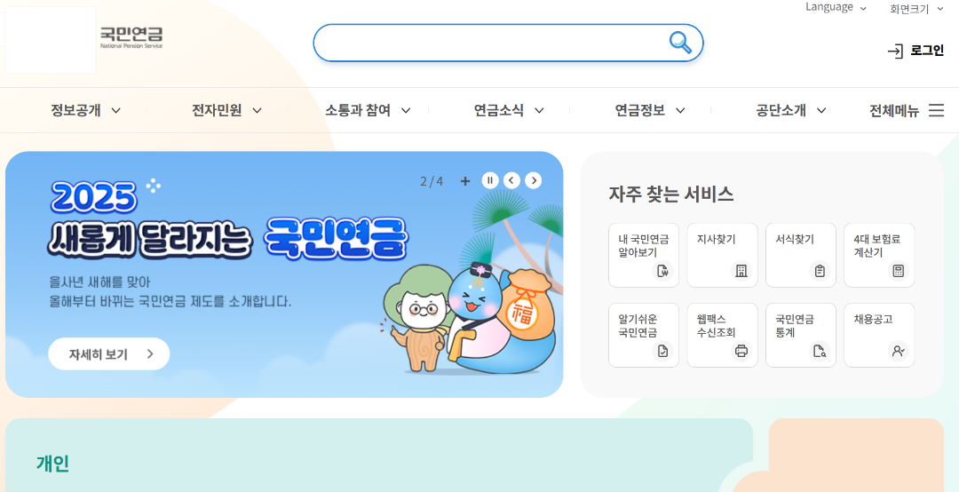 홈페이지 상단 메뉴에서 "연금급여 신청"을 클릭합니다.