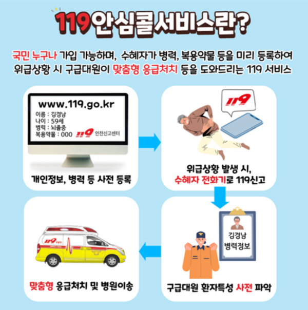 119안심콜 서비스는 응급 상황 발생 사전에 등록된 정보를 119 구급대원에게 제공하여 맞춤형 응급 처치 및 신속한 병원 이송을 가능하게 하는 서비스입니다.