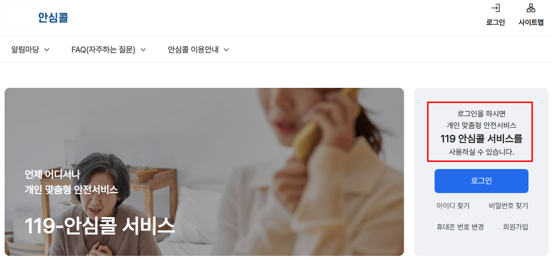 공식 홈페이지 접속 후 '119 안심콜 서비스 메뉴' 클릭